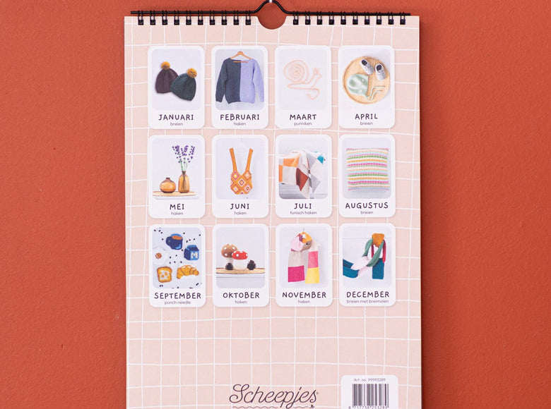 The calendar pages where you write your important dates are bilingual in Dutch and English, while the patterns are printed in Dutch* with QR codes linking to the English versions. On the back cover you will find a handy preview of all twelve designs.